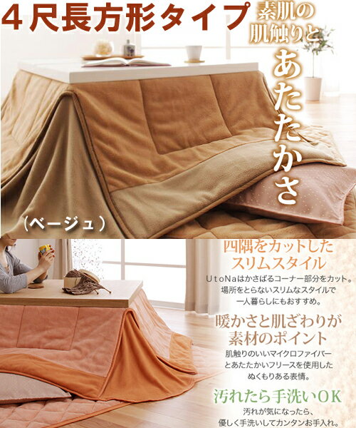 ■四隅をカットしたスリムスタイプUtonaはかさばるコーナー部分をカット。場所をとらないスリムなスタイルで一人暮らしにもおすすめ。■暖かさと肌ざわりが素材のポイントフリースと肌触りのいいマイクロファイバーとあたたかいフリースを使用したぬくもりある表情。■汚れたら手洗いOK汚れが気になったら、優しく手洗いしてカンタンお手入れ。いつでも清潔に保てます。<梱包サイズ>全サイズ共通/約72cm×52cm×57cm ↑【長方形タイプはココをクリック】 【4尺長方形タイプはココをクリック】↑