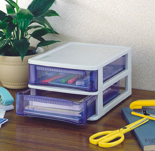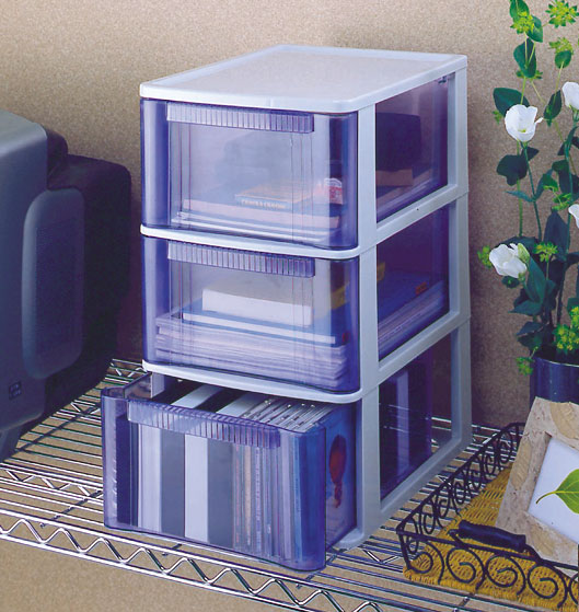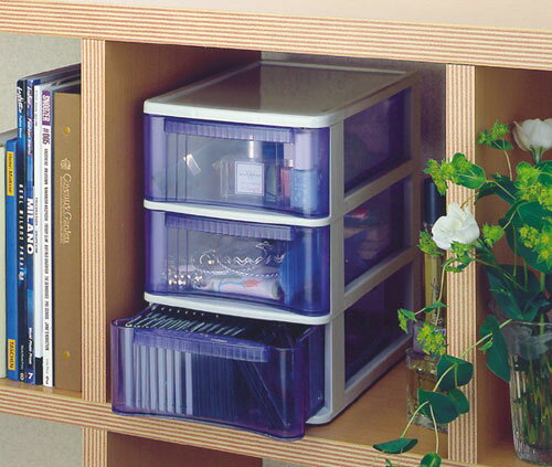 小物類の整理整頓に便利なホワイトのフレームとスチロール製クリアブルーのおしゃれな引出しのチェストです。引出しにはA5サイズまでの書類が入り、脱落防止用のストッパーが付いています。深型の引出しにはCDを収納できます。また、チェスト底面には傷防止用のゴムが付いています。◆商品サイズ(約):幅18.5×奥行25.2×高さ26.8cm◆引出内寸(約):幅15.6×奥行23.1×高さ7.4cm◆主用素材:ポリプロピレン、スチロール